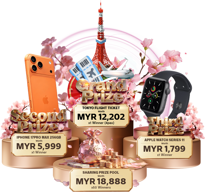 Stand a chance to win Flight Tickets to Tokyo, a stunning iPhone 17 Pro Max, or a stylish Apple Watch Series 11! Plus, 50 more lucky winners will share a prize pool of RM18,888, with total rewards up to RM38,888!